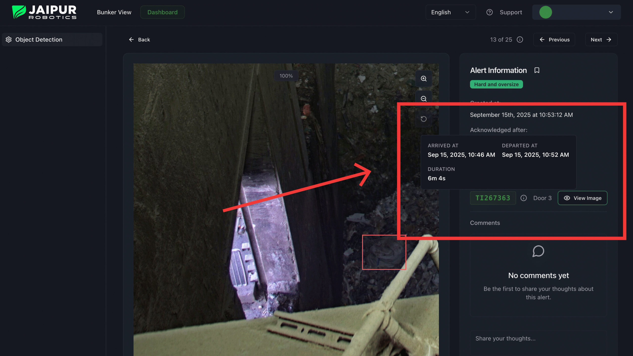 Hello! Our latest update introduces License Plate Recognition into your Jaipur Robotics Dashboard. This feature makes alerts more informative by linking detected waste directly to specific trucks, giving you clear context at a glance.